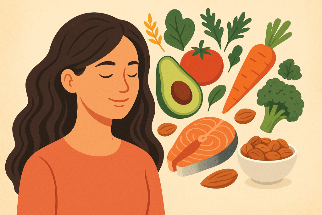 الأطعمة الغنية بالأحماض الدهنية أوميغا 3 (مثل الأسماك الدهنية وبذور الكتان) وفيتامين E (مثل المكسرات والبذور والأفوكادو) تساعد على ترطيب الشعر ومنحه لمعانًا طبيعيًا وقوة.