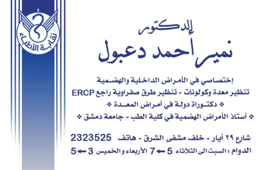 من هو الأستاذ الدكتور نمير دعبول هو أستاذ الأمراض الداخلية والهضمية والكبد في كلية الطب البشري في جامعة دمشق الحائز على شهادة من جامعات ومستشفيات بو خارست رومانيا أستاذ أمراض الهضم والكبدوالتنظير الهضمي في الشعبة الهضمية مشفى المواساة الجامعي بدمشق ومشرف على قسم الأمراض الباطنة بجامعة دمشق عميد كلية الطب البشري في جامعة القلمون الخاصة